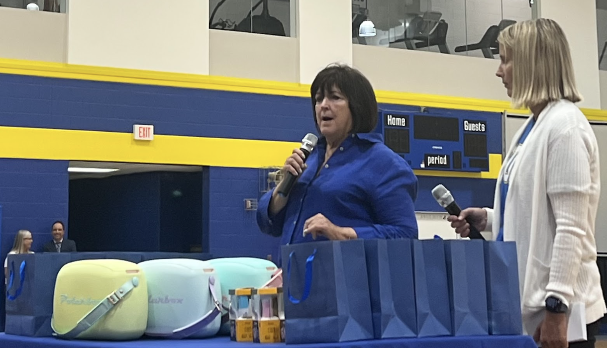 Assistant Principal Liz Huebner (left) and Principal Lindsay Jordan (right) explain the details of the 2025 Arrow Card Drive. Photo by Caroline Ryden.